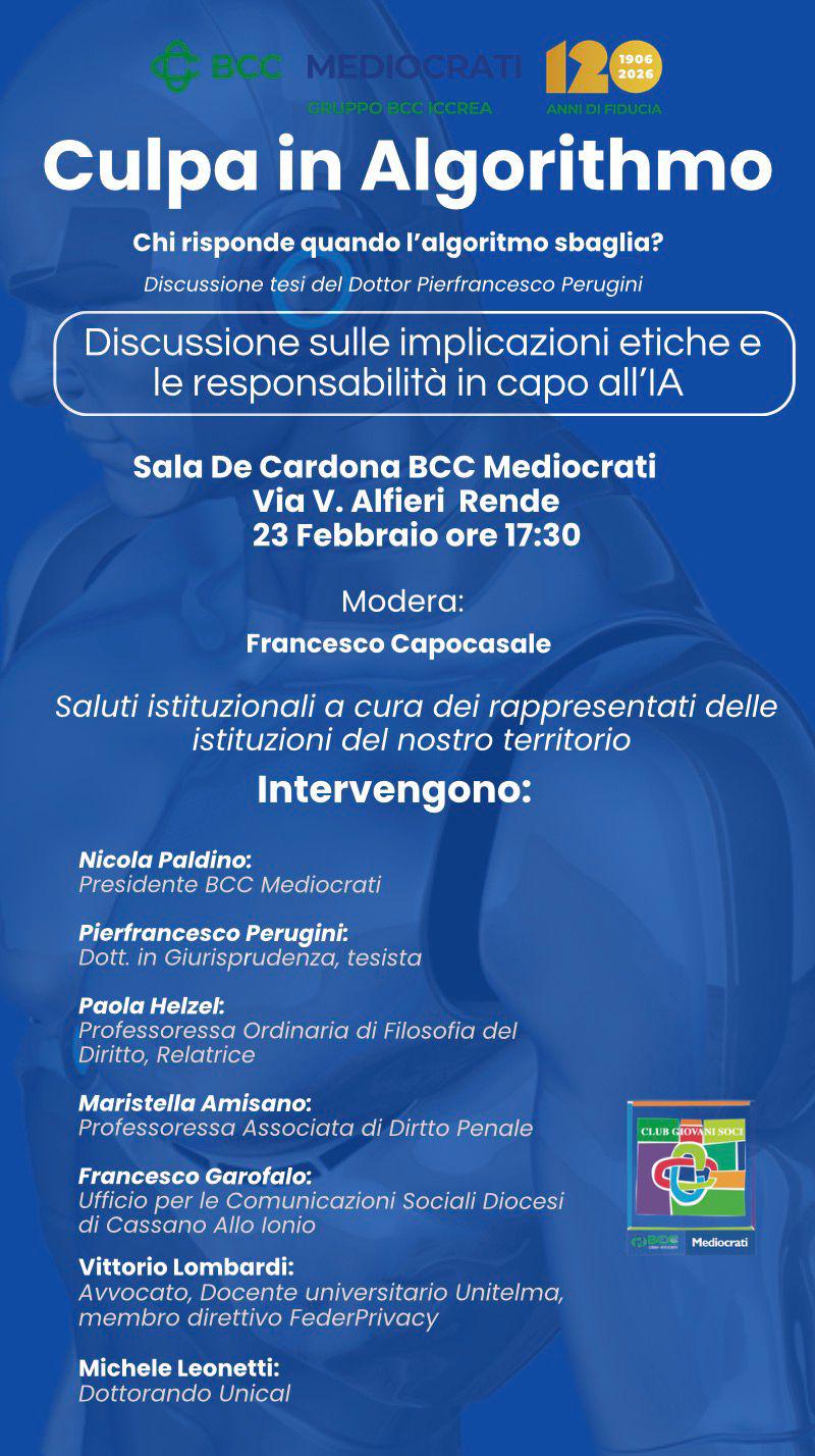 RENDE Lunedì 23 febbraio, alle ore 17:30, presso la Sala De Cardona della BCC Mediocrati di Rende (Via V. Alfieri), si terrà la conferenza “Culpa in Algorithmo: Chi risponde quando l’algoritmo sbaglia?”, in occasione della discussione della tesi di laurea in filosofia del diritto del Dott. Pierfrancesco Perugini, laureato in Giurisprudenza presso l’Università della Calabria. L’evento, che vede la partecipazione di Federprivacy, affronterà le implicazioni etiche e le responsabilità giuridiche legate all’utilizzo dell’Intelligenza Artificiale: un tema di straordinaria attualità che interroga il mondo del diritto, delle istituzioni e della società civile.