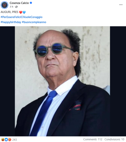 Come se non bastasse, oggi è arrivato il bis. Commenti ancora aperti (qui il coraggio diventa quasi temerarietà) e una foto solenne del presidente onorario Eugenio Guarascio, occhiali da sole e sguardo proiettato verso un orizzonte che probabilmente non tutti i comuni mortali riuscirebbero a distinguere. Didascalia: “Auguri, Pres”, stavolta per il suo compleanno, con tanto di cuori rossoblù e hashtag #PerEssereFeliciCiVuoleCoraggio.