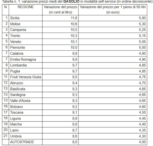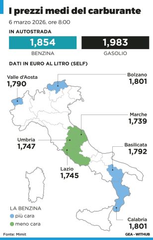 In appena 2 giorni, dal 4 al 6 marzo, il gasolio self è aumentato di 11,6 cent al litro in Sicilia, pari a 5,80 euro in più per un pieno di 50 litri, mentre la benzina self ha sfondato la soglia di 1,8 euro in Calabria e a Bolzano. E’ quanto emerge dallo studio dell’Unione Nazionale Consumatori basato sulle medie regionali e autostradali calcolate giornalmente dal Mimit. La classifica delle regioni che in 2 giorni hanno registrato i maggiori rialzi per quando riguarda il gasolio in modalità self service vede al 1° posto la Sicilia, con un balzo di 11,6 cent al litro (+5,80 euro a rifornimento). Medaglia d’argento per il Molise (+10,6 cent equivalenti a 5,30 euro per un pieno), sul gradino più basso del podio la Campania (+10,5 cent, +5,25 euro a rifornimento). La regione più virtuosa, l’Umbria (+8,6 cent, +4,30 euro) anche se l’incremento più basso è per le autostrade: +8 cent, +4 euro per un pieno. Certo le autostrade segnano il minore rincaro, anche perché hanno i prezzi in valore assoluto più alti: 1.983 euro al litro. Rispetto al territorio, vince Bolzano con 1,969 euro, al secondo posto la Calabria con 1,946, medaglia di bronzo per Trento con 1,943 euro. Per quanto riguarda la benzina, rispetto al prezzo pubblicato oggi, vincono Calabria e Bolzano che sono le prime a sfondare la soglia di 1,8 euro (1,801), seconde solo alla rete autostradale che segna 1,854 euro. Segue la Basilicata con 1,792. Per la classifica delle regioni che hanno la maggiore crescita dei prezzi della benzina self, la medaglia d’oro va alla Campania e al Molise che dal 4 al 6 marzo segnano una variazione di 4,4 cent al litro, 2 euro e 20 per un pieno di 50 litri.