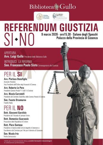 Il prossimo 9 marzo 2026 alle ore 15.30, nel Salone degli Specchi del Palazzo della Provincia di Cosenza, si terrà l’incontro pubblico dal titolo “Referendum Giustizia – Sì o No”, promosso in collaborazione con l’Ordine degli Avvocati di Cosenza e la Camera Penale di Cosenza “Avv. Fausto Gullo”. Un appuntamento che si inserisce pienamente nella vocazione storica della Biblioteca: essere spazio di elaborazione critica, laboratorio di idee, luogo di dialogo tra culture politiche diverse.
