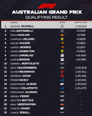 George Russell con la Mercedes ha ottenuto la pole position del GP d’Australia, gara che domani apre il Mondiale di F1 2026. In prima fila partirà anche la seconda Mercedes, guidata da Kimi Antonelli.