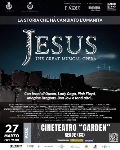 RENDE Il Cineteatro Garden di Rende ospiterà la prima assoluta serale di “JESUS – The Great Musical Opera”, la nuova pièce firmata PALMO Produzioni, una creazione teatrale e musicale che ambisce a ridefinire il rapporto tra musical contemporaneo, live concert e racconto simbolico. Dopo il successo delle produzioni originali “Bretia – Regina dei Ribelli”, dedicata alla prima donna guerriera della storie e fondatrice di Cosenza, e “9 – Il Musical”, omaggio teatrale alla storia di Gigi Marulla, PALMO prosegue il proprio percorso creativo con un’opera che porta in scena un linguaggio artistico più ampio, visionario e internazionale. “JESUS – The Great Musical Opera” non è uno spettacolo religioso e non è una semplice trasposizione evangelica. È un’opera musicale contemporanea che fonde teatro, concerto pop-rock, danza, iconografia simbolica e linguaggi visivi immersivi, trasformando uno dei racconti più conosciuti della storia occidentale in una narrazione emotiva, potente e sorprendentemente attuale. L’opera è costruita come un grande affresco teatrale in due atti, articolato in 23 quadri scenici, nei quali la figura di Cristo emerge attraverso una drammaturgia simbolica, moderna e non dogmatica. La narrazione — in lingua italiana — dialoga con una colonna sonora composta da celebri brani internazionali interpretati dal vivo nella loro lingua originale, trasformati in strumenti narrativi capaci di raccontare conflitti interiori, tensioni spirituali e fragilità profondamente umane.