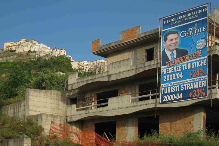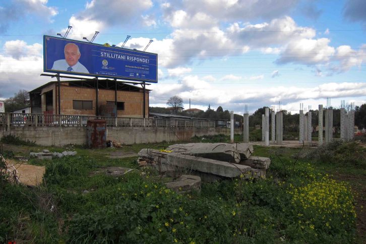 Un racconto della Calabria tramite fotografie che va avanti da quasi 30 anni, senza fermarsi. «Nell’ultimo anno penso di aver scattato 80-90 foto. Ma la produzione è costante, ogni volta trovi cose nuove e diverse». A volte, però, torna sul luogo di una foto scattata oltre 30 anni fa. Com’è successo a Mesoraca, nel Crotonese, dove Angelo Maggio fotografa una realtà che in tanti anni non è migliorata, ma peggiorata: «Per me questa foto è drammatica. I fabbricati sono rimasti gli stessi, ma mancano le persone. Sono immagini che ti danno l’idea di una società che non è esattamente meravigliosa come qualcuno dice. Continuiamo a pensare alle coste, al mito del turismo che ci salverà, ma se andassimo a vedere foto che ho scattato nel 1998 notiamo che la situazione non è cambiata molto». L’edificio incompleto più impressionante? «Per me l’ippodromo di Portigliola. Più che altro perché è fantastica l’assurdità di cosa hanno creato. Su una collina che guarda il mar Ionio, anche difficile da raggiungere, hanno realizzato un ippodromo che poi è stato abbandonato subito. Ogni tanto vedi alcune cose che ti fermi e dici: “Ma come gli è venuto in mente di fare sta cosa?”». Ma nella sua produzione, c’è anche spazio all’ironica rappresentazione della politica immersa nel non finito: «Una cosa che mi ha sempre sconvolto sono i manifesti elettorali». Politici, assessori, candidati alle regionali che per pubblicizzarsi utilizzano come sfondo edifici incompleti, in preda al cemento e all’incuria. «Mettevano i loro volti e i loro slogan in queste situazioni, creando una contrapposizione assurda e molto divertente».