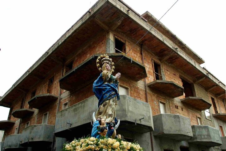 LAMEZIA TERME L’idea nasce una domenica di Pasqua, nel lontano 2004. Durante uno dei tradizionali riti pasquali a San Luca Angelo Maggio, fotografo etnografico, scatta una foto: la statua del Cristo portata dai fedeli e, sullo sfondo, il grigio cemento di un edificio incompleto: «La trovai una foto dura, ma mostrandola ad alcuni abitanti di là mi accorsi che invece era piaciuta». Ciò che ai suoi occhi sembrava una contraddizione, per gli altri era uno scatto normale, un’istantanea di un rito tradizionale a cui la comunità era legata. «Iniziai a fare altre foto di santi inseriti in quei contesti, ma nessuno trovava qualcosa di negativo. Le ritenevano foto normalissime». È questa la contrapposizione che più incuriosisce Angelo Maggio, che di lì a poco darà il via al progetto Cemento Amato: una raccolta di istantanee calabresi, tra il non finito degli edifici e il volto di chi questa realtà la vive quotidianamente.