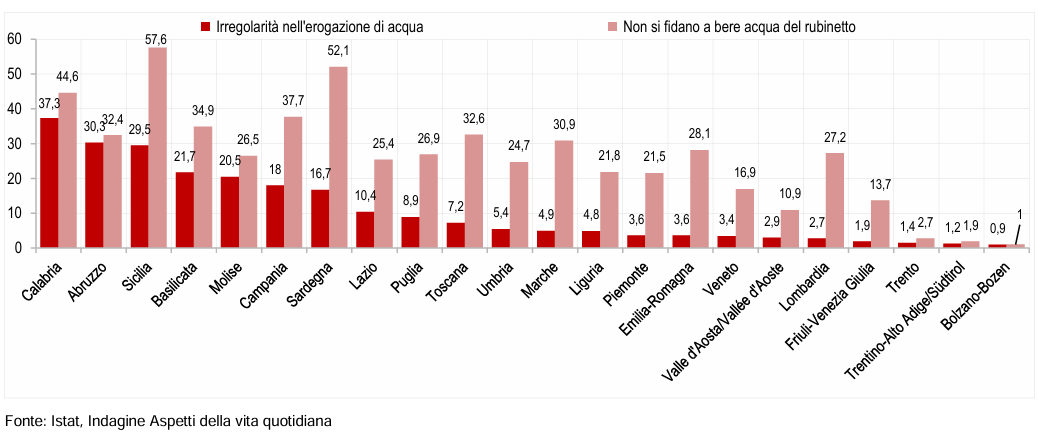 Ancora più allarmante il dato relativo alle carenze idriche segnalate dalle famiglie: la Calabria nel 2025 «si conferma la regione più esposta ai problemi di erogazione dell’acqua nelle abitazioni», con il 37,4% che segnala irregolarità, ben oltre la media nazionale del 10% e in aumento rispetto al 7,4% rispetto all’anno precedente. Quasi la metà dei calabresi, il 44,6%, non si fida a bere acqua dal rubinetto, meno solo di Sicilia e Sardegna. Un dato che si lega a quello riguardo l’insoddisfazione per il servizio idrico con la Calabria che è la quota minore di famiglie che si dichiarano soddisfatte (il 64% rispetto a una media nazionale dell’84,6% nel 2025). Disagi che si riversano anche nel settore agricolo, la cui disponibilità di riserve idriche è già condizionata – in maniera negativa – «dagli effetti del cambiamento climatico e la crescente pressione sugli ecosistemi». In Calabria la difficoltà nella gestione delle risorse idriche incide sul 96,4% delle aziende agricole, un dato ancora superiore rispetto a quello nazionale, ma leggermente più basso rispetto alle altre regioni del Sud che vivono le stesse difficoltà. Anche il turismo, l’altro settore cardine dell’economia calabrese, riflette queste difficoltà: non a caso i periodi più complessi coincidono con il boom di turisti, con un carico eccessivo su un sistema idrico già fragile di suo. Dati, quelli dell’Istat, che inquadrano un’emergenza strutturale della Calabria tra sistemi vetusti e perdite, siccità ed eventi estremi che incidono sulla gestione delle risorse. (ma.ru.)