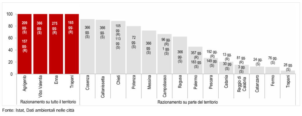 A certificarlo sono gli ultimi dati Istat riguardo la carenza idrica tra il 2023 e il 2025. Nel report pubblicato venerdì 20 marzo, l’Istituto segnala come l’Italia resti tra i paesi europei che ricorrono più all’uso di acqua potabile, ma che al tempo stesso almeno il 5,8% della popolazione nel 2024, ovvero oltre un milione di persone, è stata coinvolta da misure di razionamento dell’erogazione dell’acqua. Un dato in aumento rispetto all’anno prima e che riguarda soprattutto Calabria e Sicilia. In tutti i capoluoghi calabresi, eccetto Crotone, sono state adottate misure di razionamento. In particolare a Vibo Valentia, unica insieme ad Agrigento ad attuare tutti i giorni (per il capoluogo vibonese solo le ore notturne) limiti all’utilizzo dell’acqua.