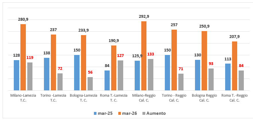 Agli aumenti generalizzati emersi dal report nazionale dell’ONF del 47%, si aggiungono gli aumenti particolari registrati per raggiungere la Calabria. Il costo dei biglietti ferroviari verso la nostra regione variano di giorno in giorno, sono esposti ad una variabilità che manda in pallone chi deve mettersi in viaggio ma è nella difficoltà di decidere in tempo il giorno della partenza. Federconsumatori Calabria ha simulato la prenotazione in diversi giorni della settimana antecedente la Pasqua 2026: l’altalena di prezzi per gli stessi treni e la stessa classe è divenuta una variabile intollerabile. Sono state comparate le offerte di Italo e Trenitalia senza cambi per rendere più efficace l’equiparazione del costo del viaggio. Si continuano a rilevare le migliori offerte di viaggio di Italo che su tutte le tratte della costa tirrenica su cui fa scalo (Scalea, Paola, Lamezia T.C., Vibo-Pizzo, Rosarno, Villa S. Giovanni e Reggio Calabria Centrale), per le stesse fermate consente di risparmiare sino al 40% % rispetto alle offerte del maggior competitor Trenitalia. Federconsumatori Calabria ha elaborato i dati relative alle principali destinazioni di Lamezia Terme e Reggio Calabria per rendere evidenti le differenze anche fra i diversi vettori. Stessi incrementi si registrano però verso tutte le destinazioni prese in esame: Scalea, Paola, Cosenza, Lamezia T., Crotone, Vibo-Pizzo- Rosarno, Villa S. Giovanni e Reggio Calabria. Il grafico 1 rende evidente gli aumenti registrati nel 2026 sul 2025 nel confronto delle offerte tariffarie delle frecce nella settimana antecedente la Pasqua: dal 56% (Bologna- Lamezia T.) sino al 133% (Milano – Reggio Cal. C.).