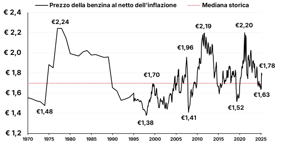 Il terzo punto riguarda la necessità dell’intervento. È vero che i prezzi dei carburanti sono aumentati negli ultimi mesi, ma per valutarne il livello reale è necessario correggerli per l’inflazione. Un euro di oggi non vale quanto un euro di vent’anni fa. Per questo motivo, il confronto corretto deve essere fatto in termini reali. Secondo elaborazioni simili a quelle di Carlo Cottarelli scritte sul Corriere della Sera, il prezzo della benzina attuale – circa 1,775 euro al litro in termini reali – è solo leggermente superiore alla mediana storica dal 1970, pari a circa 1,697 euro.