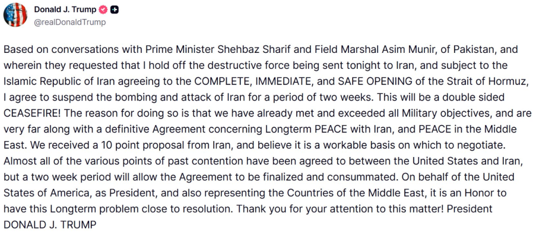 “Sulla base delle conversazioni con il Primo Ministro Shehbaz Sharif e il Feldmaresciallo Asim Munir del Pakistan, durante le quali mi è stato chiesto di sospendere la forza distruttiva prevista per questa notte contro l’Iran, e a condizione che la Repubblica Islamica dell’Iran accetti la RIAPERTURA COMPLETA, IMMEDIATA e SICURA dello Stretto di Hormuz, accetto di sospendere i bombardamenti e l’attacco contro l’Iran per un periodo di due settimane. Questo sarà un CESSATE IL FUOCO BILATERALE! Il motivo di questa decisione è che abbiamo già raggiunto e superato tutti gli obiettivi militari e siamo molto avanti verso un accordo definitivo per una PACE duratura con l’Iran e per la PACE in Medio Oriente. Abbiamo ricevuto una proposta in 10 punti dall’Iran e riteniamo che sia una base praticabile su cui negoziare. Quasi tutti i principali punti di disaccordo del passato sono stati concordati tra gli Stati Uniti e l’Iran, ma un periodo di due settimane permetterà all’accordo di essere finalizzato e completato. A nome degli Stati Uniti d’America, come Presidente, e anche rappresentando i Paesi del Medio Oriente, è un onore vedere questo problema di lunga data vicino alla risoluzione. Grazie per l’attenzione su questa questione!”.