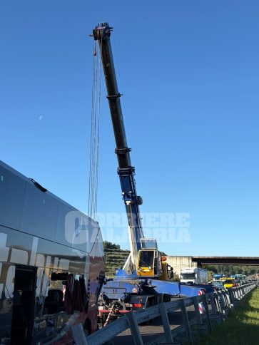L’incidente all’alba in direzione nord. Il mezzo Italbus ha terminato la corsa sulla carreggiata sud: nessun ferito grave