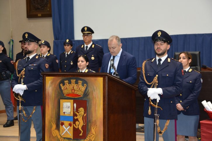 Festa della Polizia anche a Vibo Valentia con una cerimonia che si è tenuta presso l’Auditorium della Scuola Allievi Agenti “Andrea Campagna”. La cerimonia si è svolta alla presenza del Prefetto della Provincia di Vibo Valentia, dei rappresentanti della Magistratura, del Sindaco, dei Comandanti delle altre Forze di Polizia, di altre cariche istituzionali e politiche regionali, nonché delle organizzazioni sindacali, dei rappresentanti dell’A.N.P.S. e delle associazioni combattentistiche e d’Arma e di una rappresentanza di studenti delle scuole primarie della provincia. La giornata ha avuto inizio alle ore 9.15 con la tradizionale deposizione, da parte del Prefetto, Dr.ssa Anna Aurora Colosimo, e del Questore della Provincia di Vibo Valentia, Dr. Rodolfo Ruperti, di una corona d’alloro al Monumento ai Caduti della Polizia di Stato. Nel corso della cerimonia istituzionale, iniziata alle ore 11:00, è stata data lettura dei messaggi fatti pervenire dal Presidente della Repubblica, dal Ministro dell’Interno e dal Capo della Polizia – Direttore Generale della Pubblica Sicurezza. Anche il Questore Ruperti ha rivolto un proprio pensiero alle donne e agli uomini della Polizia di Stato, sottolineando il quotidiano lavoro svolto in questa provincia, ed il continuo impegno volto a garantire sempre maggiore sicurezza e libertà, tenendo sempre presente l’obiettivo prioritario della lotta alla criminalità organizzata. Durante la cerimonia, è stato inoltre proiettato un video in cui sono state raccolte alcune delle attività svolte dalla Polizia di Stato di Vibo Valentia durante l’anno. Successivamente, il Prefetto e il Questore hanno consegnato le ricompense al personale della Polizia di Stato che si è distinto per meriti straordinari, speciali e per lodevole comportamento. L’intera cerimonia è stata accompagnata dai brani musicali eseguiti del coro di voci bianche e dell’orchestra della scuola secondaria di primo grado dell’Istituto Comprensivo “1° Circolo Garibaldi – Buccarelli” di Vibo Valentia. Al termine dell’evento, per i piccoli ospiti presenti la festa è proseguita con la visita agli stand espositivi e ai mezzi della Polizia di Stato, per un momento di condivisione con la grande famiglia della Polizia e con l’amico a 4 zampe “Max” della Squadra Cinofili della Questura oltre che con la distribuzione di gadget per tutti loro.