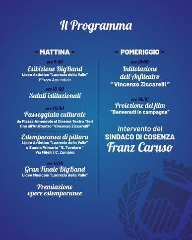 Il programma della giornata del 16 aprile prevede, al mattino, una sorta di prologo al clou del pomeriggio. Alle ore 9,30, in Piazza Amendola, l’esibizione della Big Band del Liceo Artistico “Lucrezia della Valle” cui seguiranno, alle ore 10,00, i saluti istituzionali. Alle 10,30 prevista una passeggiata culturale da Piazza Amendola al Cinema Italia-Tieri fino all’anfiteatro. La giornata sarà arricchita da una estemporanea di pittura cui parteciperanno gli studenti del Liceo artistico “Lucrezia della Valle” e della scuola primaria “Emma Tavolaro” di via Milelli (Istituto comprensivo Zumbini). Alle 11,30 il Gran finale della Big Band del Liceo Artistico “Lucrezia della Valle” cui farà seguito la premiazione delle opere dell’estemporanea di pittura che saranno giudicate da una giuria composta dalla direttrice del Museo dei Brettii e degli Enotri, Marilena Cerzoso, dall’artista Luigia Granata e dalla giovane pittrice Giorgia Cerchiara.