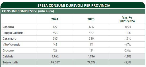Beni durevoli: nel 2025 in Calabria spesi 1,7 miliardi, -1,5%