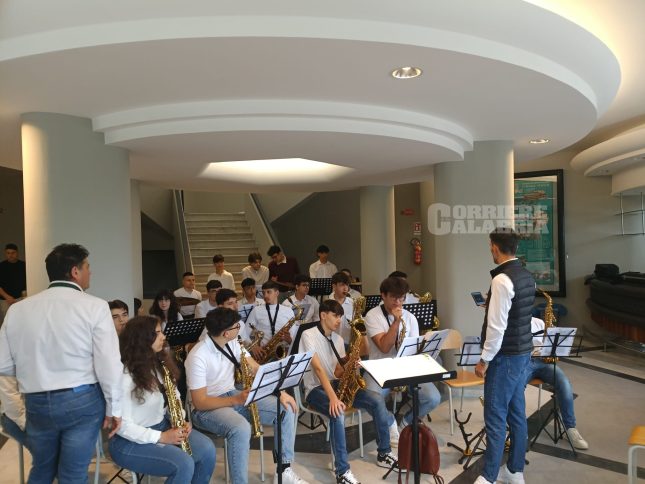 Dopo i ragazzi delle medie, spazio a Massimo Perna e alla sua Big Band, l’orchestra del liceo Lucrezia della Valle: presente anche la dirigente Rossana Perri.
