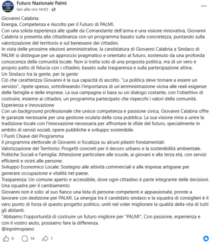 Nel lungo messaggio di sostegno, il profilo del candidato viene tratteggiato come quello di un amministratore pragmatico, attento alle esigenze locali e pronto a costruire un programma condiviso. Dalla valorizzazione del territorio alle politiche sociali, passando per sviluppo economico e trasparenza, il programma sembra voler abbracciare un po’ tutto ciò che serve alla città.