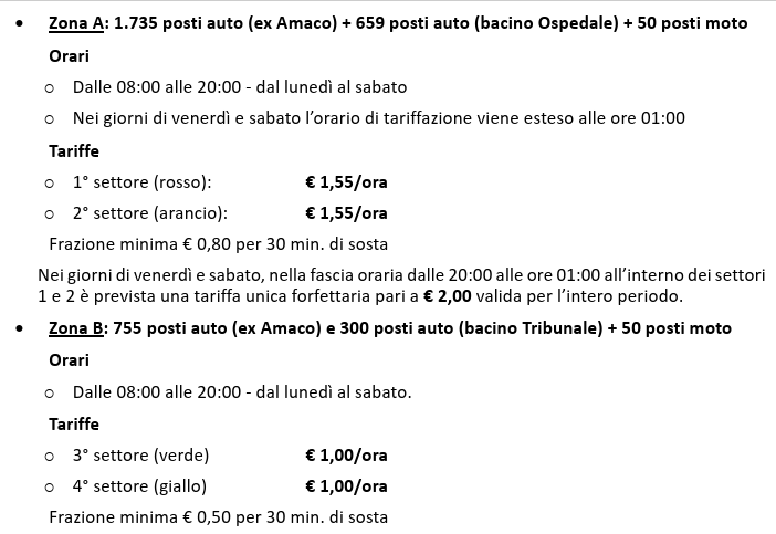A proposito di novità, per quanto riguarda le tariffe nella Zona A (centro città) «nei giorni di venerdì e sabato, nella fascia oraria dalle 20:00 alle ore 01:00 all’interno dei settori 1 e 2 è prevista una tariffa unica forfettaria pari a € 2,00 valida per l’intero periodo».