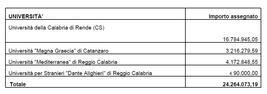 I fondi saranno distribuiti tra gli atenei calabresi secondo il seguente schema: Università della Calabria (Rende) 16,78 milioni di euro; Università Magna Graecia (Catanzaro) 3,22 milioni di euro; Università Mediterranea (Reggio Calabria): 4,17 milioni di euro; Università per Stranieri Dante Alighieri (Reggio Calabria): 90mila euro.