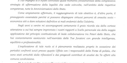 REGGIO CALABRIA «Un vivo ringraziamento per l`eccezionale lavoro svolto in questa provincia»: lo esprime il prefetto Luigi Varratta a Giuseppe Pignat…