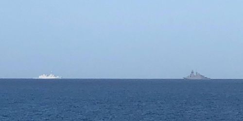 Quattro navi in manovra ben visibili dalla costa. L’esercitazione è l’ipotesi più plausibile