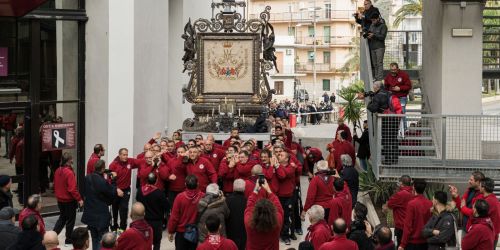 La sacra effigie trasportata nella sede del consiglio regionale dai portatori. «Spero che in tanti frequentino il Palazzo nei prossimi 4 mesi per ass…