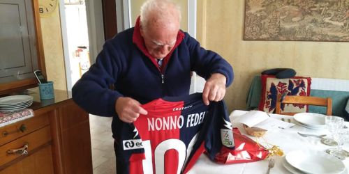 La società di Vrenna ha omaggiato il sostenitore marchigiano con una maglia personalizzata. Per lui una grande gioia
