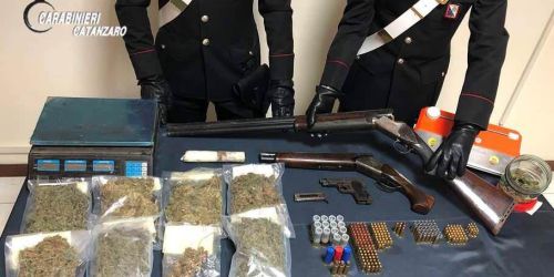 In un casolare di campagna, i militari dell’Arma hanno trovato 740 grammi di marijuana, due fucili e una pistola. Il giovane è ai domiciliari