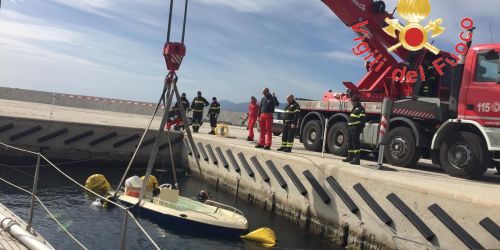 Operazione dei vigili del fuoco. In azione un’autogru. In corso accertamenti per comprendere le cause dell’affondamento