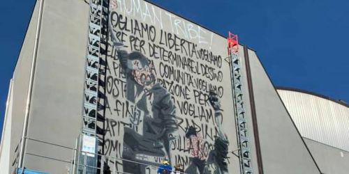 Il "black power" di Jorit sulle facciate del Palazzetto dello Sport di Rende
