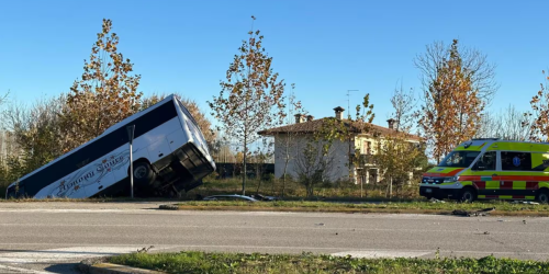 Bus con studenti a bordo si scontra con auto e finisce nel fosso