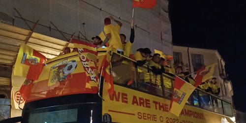 Catanzaro, festa grande per il passaggio del bus scoperto dei giocatori dominatori della serie B – VIDEO