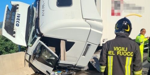 Tir si ribalta e sbatte contro un newjersey sull’A2, ferito il conducente