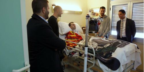 I difensori Sabato e Di Nunzio, accompagnati dal responsabile del Settore giovanile Santacroce, salutano un tifoso ricoverato del Centro clinico “San…