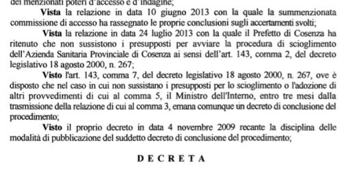 «Nessuna infiltrazione mafiosa nell`Asp di Cosenza»