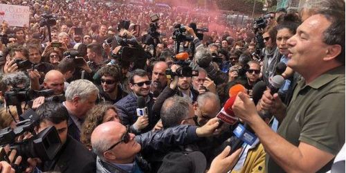 Il sindaco sospeso di Riace parla agli studenti prima di entrare in aula. «Siamo l’onda rossa contro l’onda nera che oscura l’orizzonte». Ragazzo pic…
