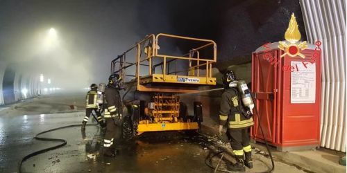 Mezzo di cantiere in fiamme in una galleria della “Due Mari”