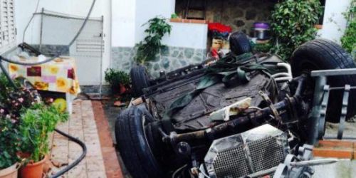 Si ribalta e finisce con l’auto nel cortile di una casa