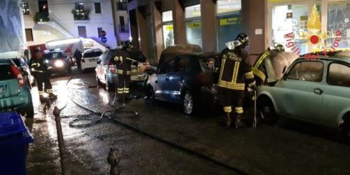 Le fiamme, domate dai vigili del fuoco, hanno distrutto le automobili parcheggiate a ridosso delle abitazioni. Indagano i carabinieri