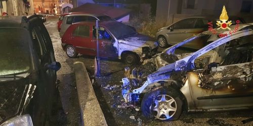 Le fiamme, domate dai vigili del fuoco, hanno distrutto le automobili parcheggiate a ridosso delle abitazioni. Indagano i carabinieri