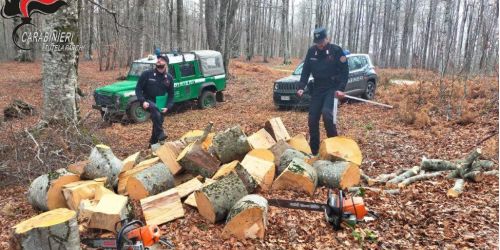 I due uomini hanno prima minacciato il Comandante dei Carabinieri, poi sono scappati. Sequestrate le motoseghe e gli autocarri