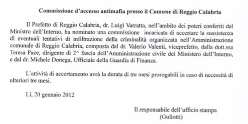 REGGIO CALABRIA «La notizia, pressoché ufficiale, relativa all`imminente arrivo della Commissione d`accesso Antimafia al Comune di Reggio Calabria ra…
