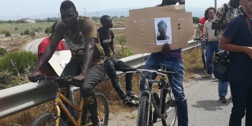 Corteo dei migranti verso il Comune di San Ferdinando. È scattato lo sciopero dei braccianti nella Piana di Gioia Tauro dopo l’omicidio di Soumalia S…