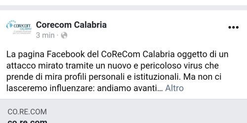 Pagina facebook del Corecom sotto attacco di un virus insinuato attraverso il tag di un sito porno