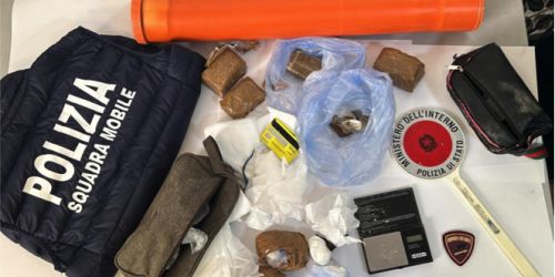 Rinvenuti 64 grammi di hashish e 24 di marjuana, due bilancini di precisione, un coltello e materiale per il confezionamento delle dosi