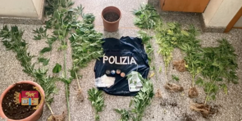 Il peso complessivo delle piante è di 1,5 kg. Operazione della Squadra Mobile e dell’unità cinofila. Requisiti anche dei semi, bilancino e grinder