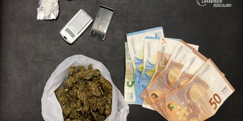 La Mobile ha sorpreso l’uomo mentre cedeva dosi ad uno straniero. Individuati e sequestrati 5 grammi di coca e 18 di marijuana oltre a denaro