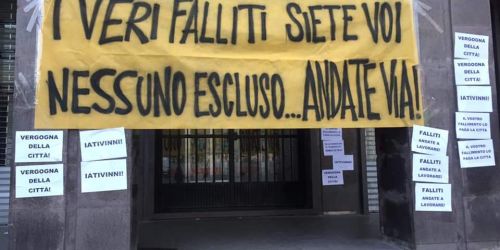 Uno striscione e decine di manifestini affissi davanti al municipio. Oggi il consiglio comunale è chiamato a prendere atto del default finanziario