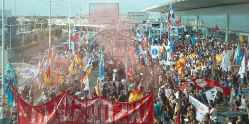 Protesta dei dipendenti della compagnia aerea dopo la rottura delle trattative. I manifestanti sono controllati a vista dalla polizia